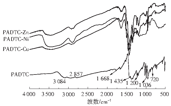 圖1 PADTC和PADTC-Cu、Ni和Zn的紅外譜圖